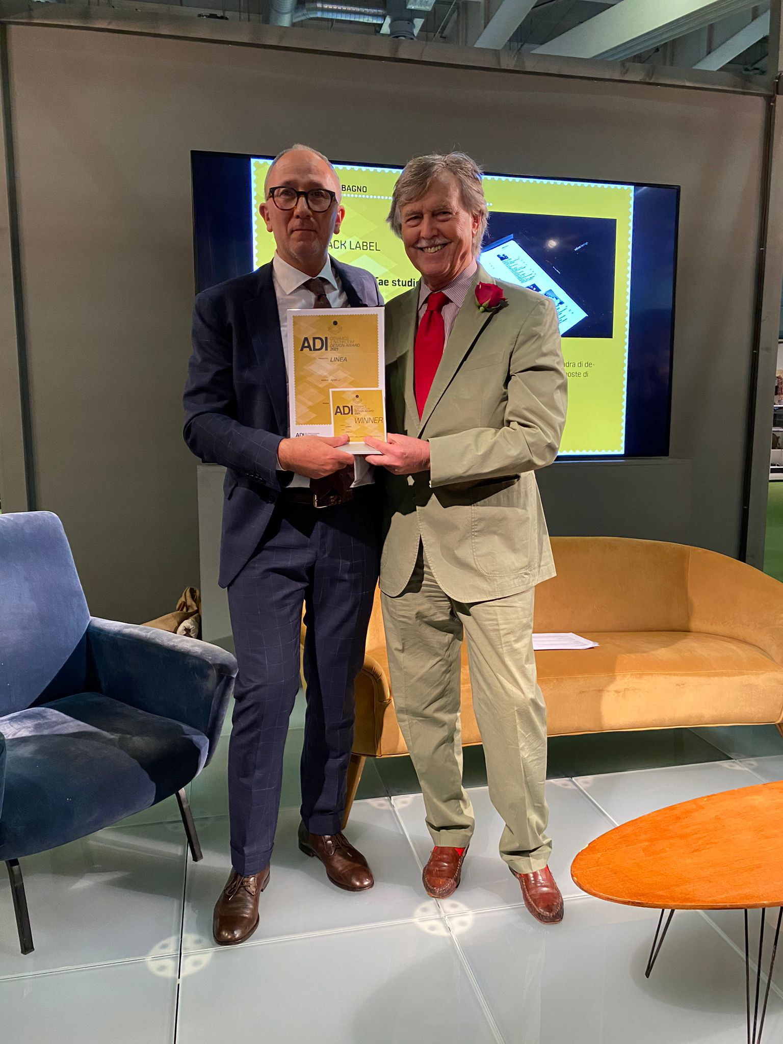 Innovazione, tecnologia e design a Cersaie 2021: la nuova gamma di box doccia Linea vince l’ADI 2021 con il suo sistema di installazione che offre un prodotto dall’estetica minimale e allo stesso tempo facile da posare in tutte le situazioni di cantiere (In foto: Oscar Colli consegna il premio a Giuseppe Presotto)