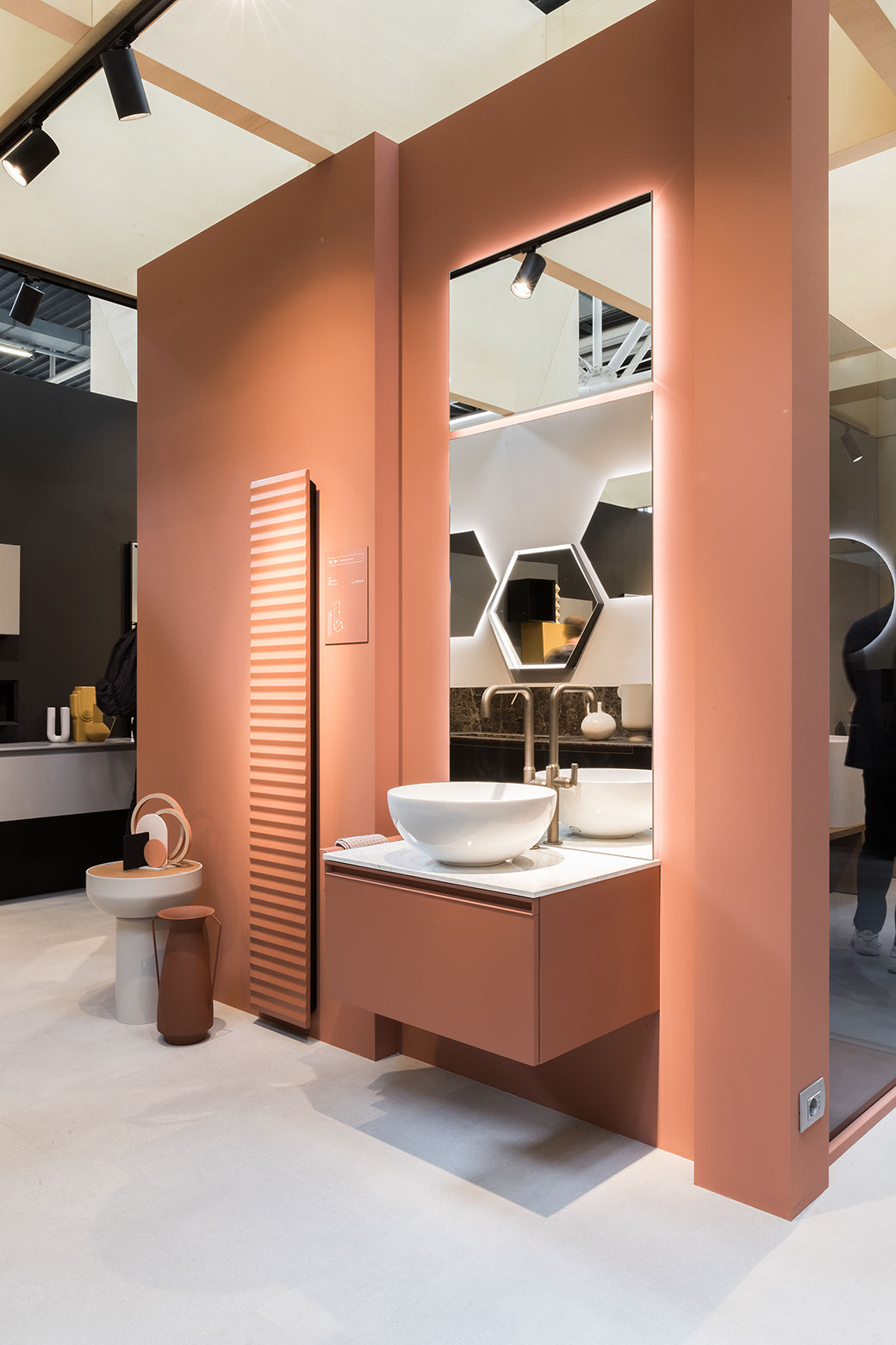 Cersaie 2021: Come cambiano i volumi a seconda della tipologia di illuminazione (in esposizione: Esagono, specchio retroilluminato a led, e Tibò esagono, con cornice metallica e illuminazione a led)