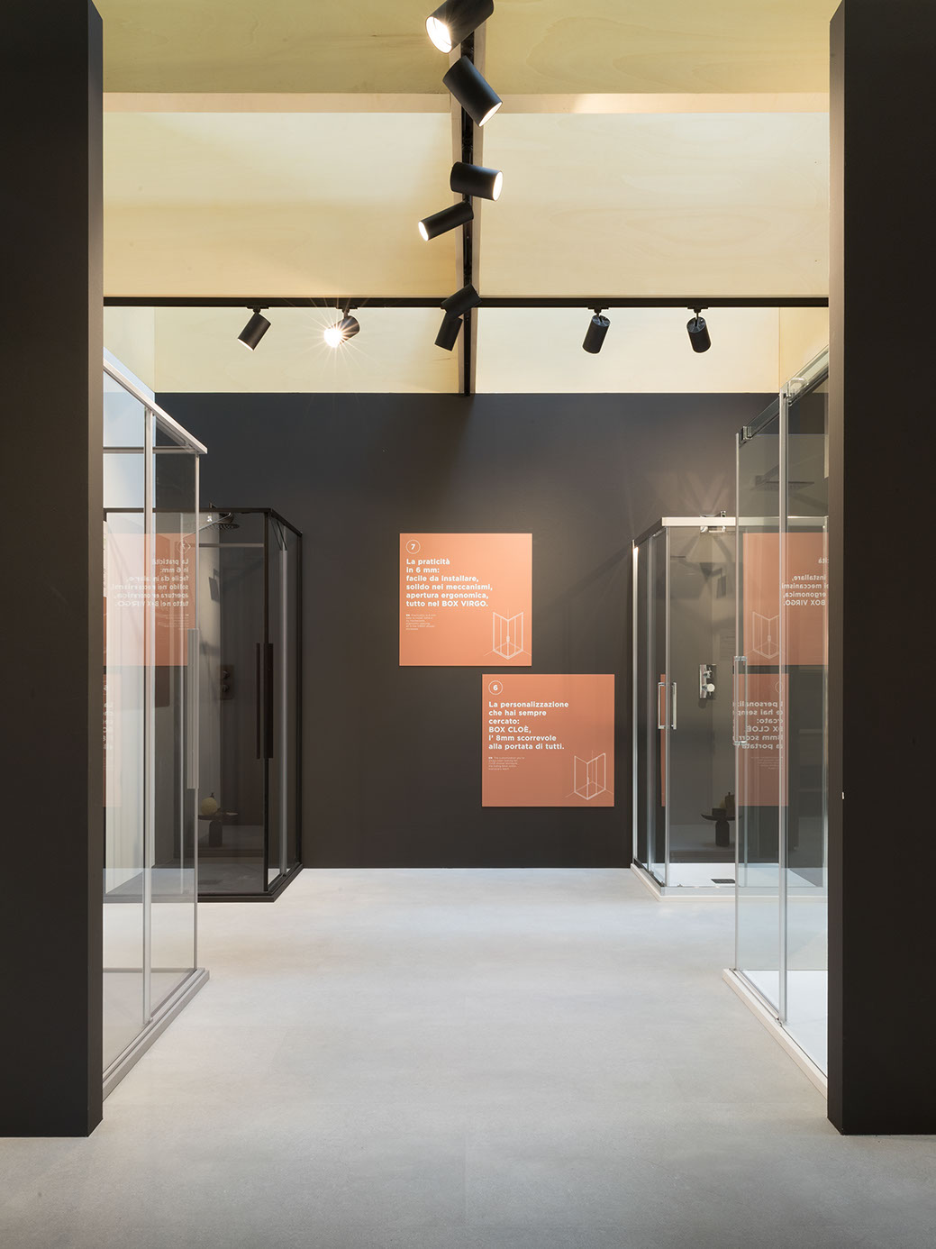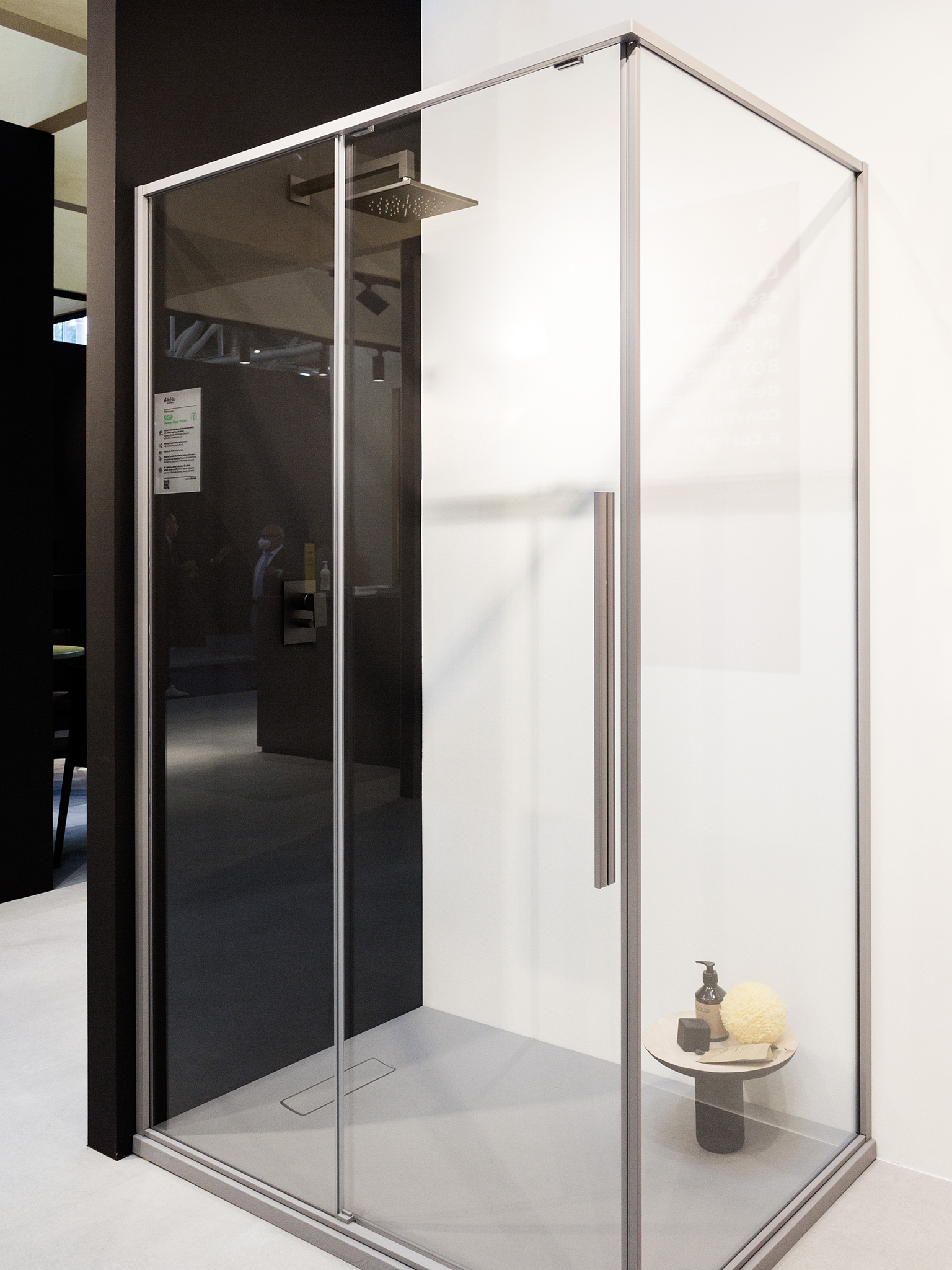 Cersaie 2021: In primo piano box doccia Otto con profili Metal Bronze, nuova maniglia G e vetro grigio Europa | in secondo piano la trasparenza del separet in vetro mostra il piatto doccia filo pavimento texturizzato in finitura Trendy bianco